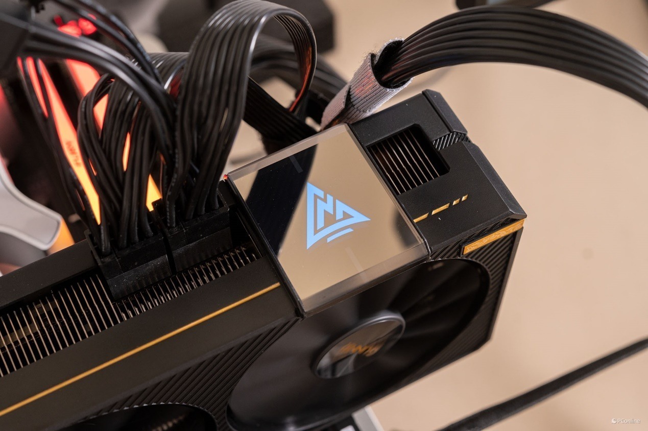 这颗品牌Logo灯在显卡通电后就会亮起,还是相当引人注目的。另外这个Logo灯不止是展示用,它还具备了检测功能。正常启动时会闪烁蓝光,如外接电源故障,则会闪烁红光。