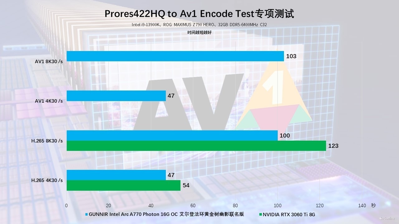 实测将一段8K的工程文件分别导出为H.265与AV1格式,采用AV1硬件加速编解码功能时,时间比RTX 3060的H.265快了接近半分钟,即使同为H.265格式,蓝戟Intel Arc A770艾尔登法环联名款的表现也更出色一些。