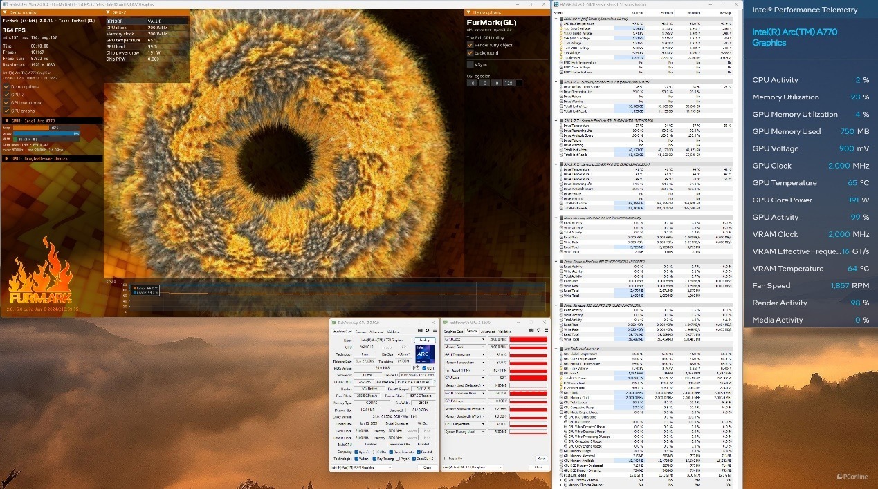 评测的最后,对蓝戟Intel Arc A770艾尔登法环联名款进行烤机测试,实测室温24℃的情况下,烤机15分钟,Furmark甜甜圈设定为1920 x 1080分辨率,蓝戟Intel Arc A770艾尔登法环联名款能够全程稳定在2050-2100MHz,PL1功耗为195W。