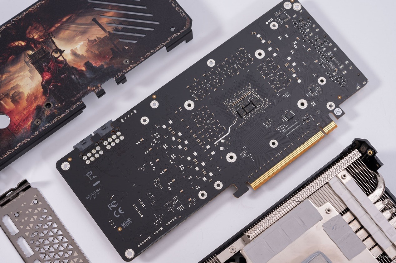 显卡的背面配备了金属背板,这不仅有助于防止PCB弯曲,还能显著提高散热效率。背板设计才是本次联名的重点,上面布满了《艾尔登法环黄金树幽影》的图案,绝对是游戏爱好者和收藏者的理想之选。