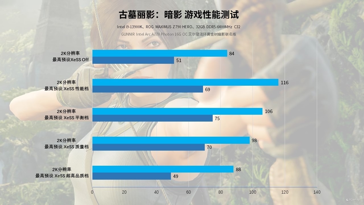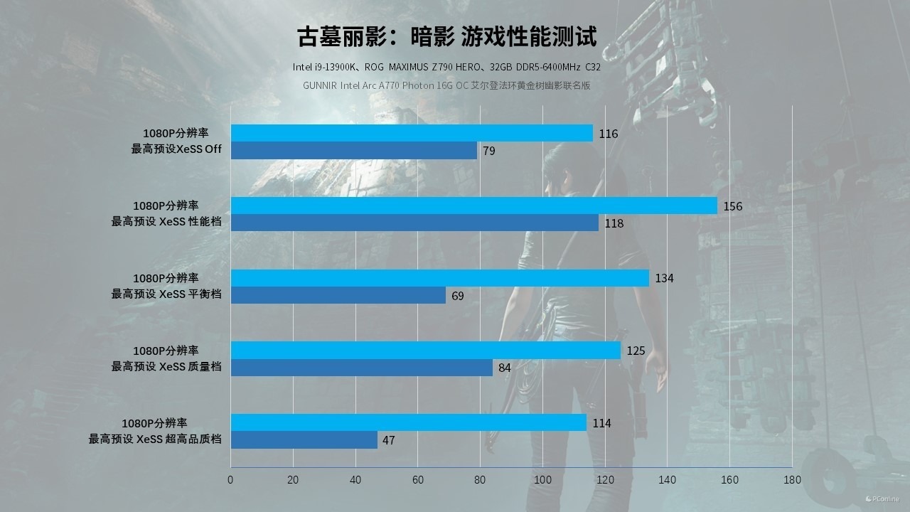 那有XeSS的游戏又怎么样呢?《古墓丽影:暗影》虽然是老游戏,但也支持XeSS技术,实测1080P下,不开启XeSS时,游戏帧数能够跑到116 FPS,如果开启XeSS性能档,游戏帧数将提升40 FPS,来到156 FPS,相当惊人。