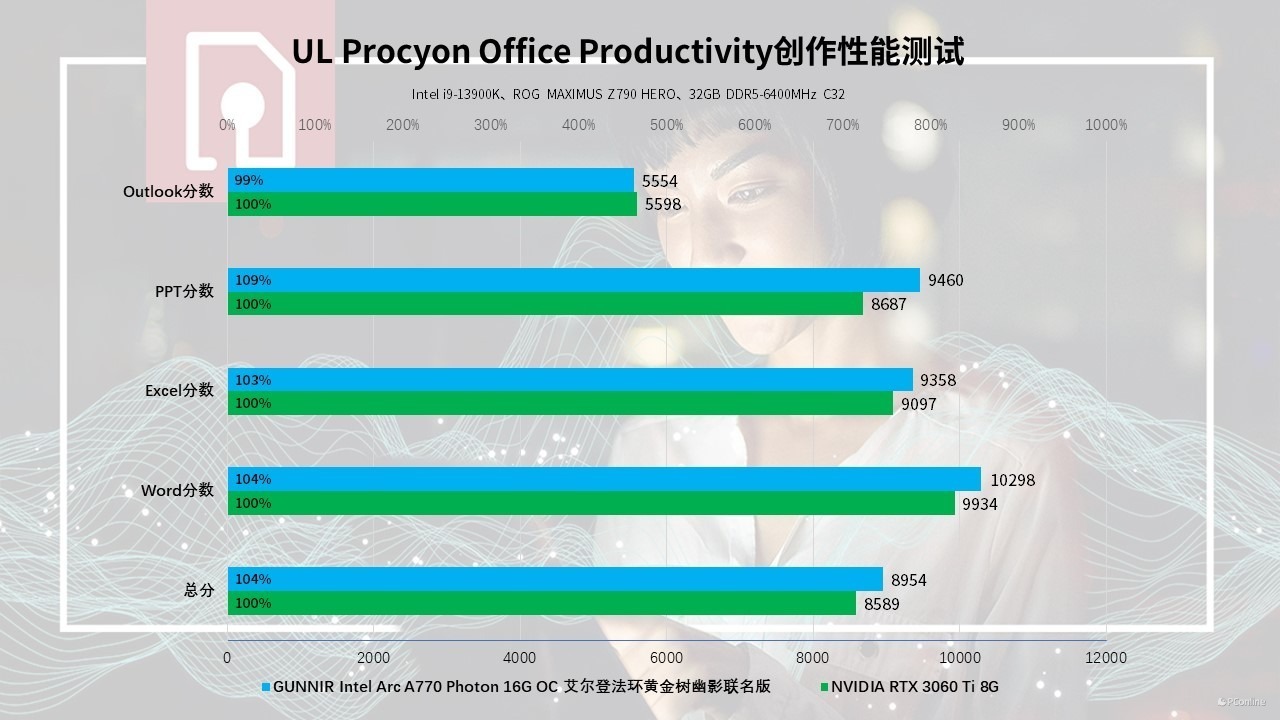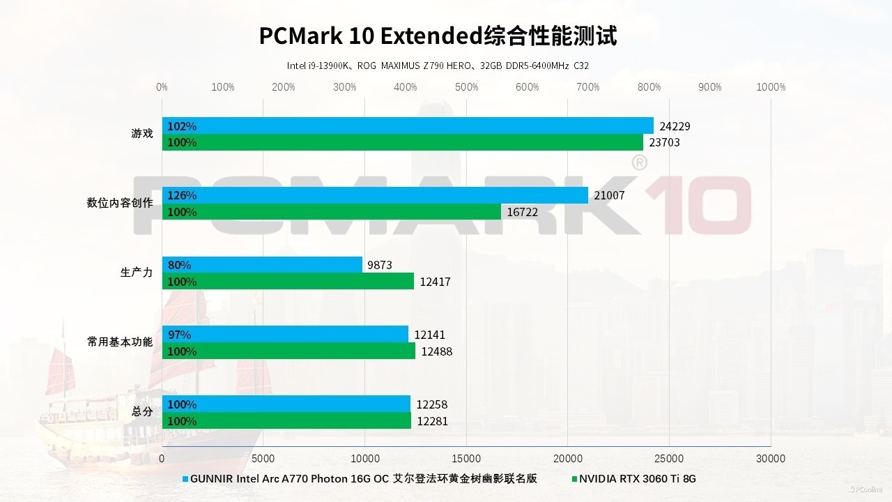 测试结果如下,两款显卡在总分方面不分伯仲,但一些测试子项目却有不同的表现,例如数位内容创作环节,拥有大显存的蓝戟Intel Arc A770艾尔登法环联名款显然更具优势,领先幅度来到了26%左右!