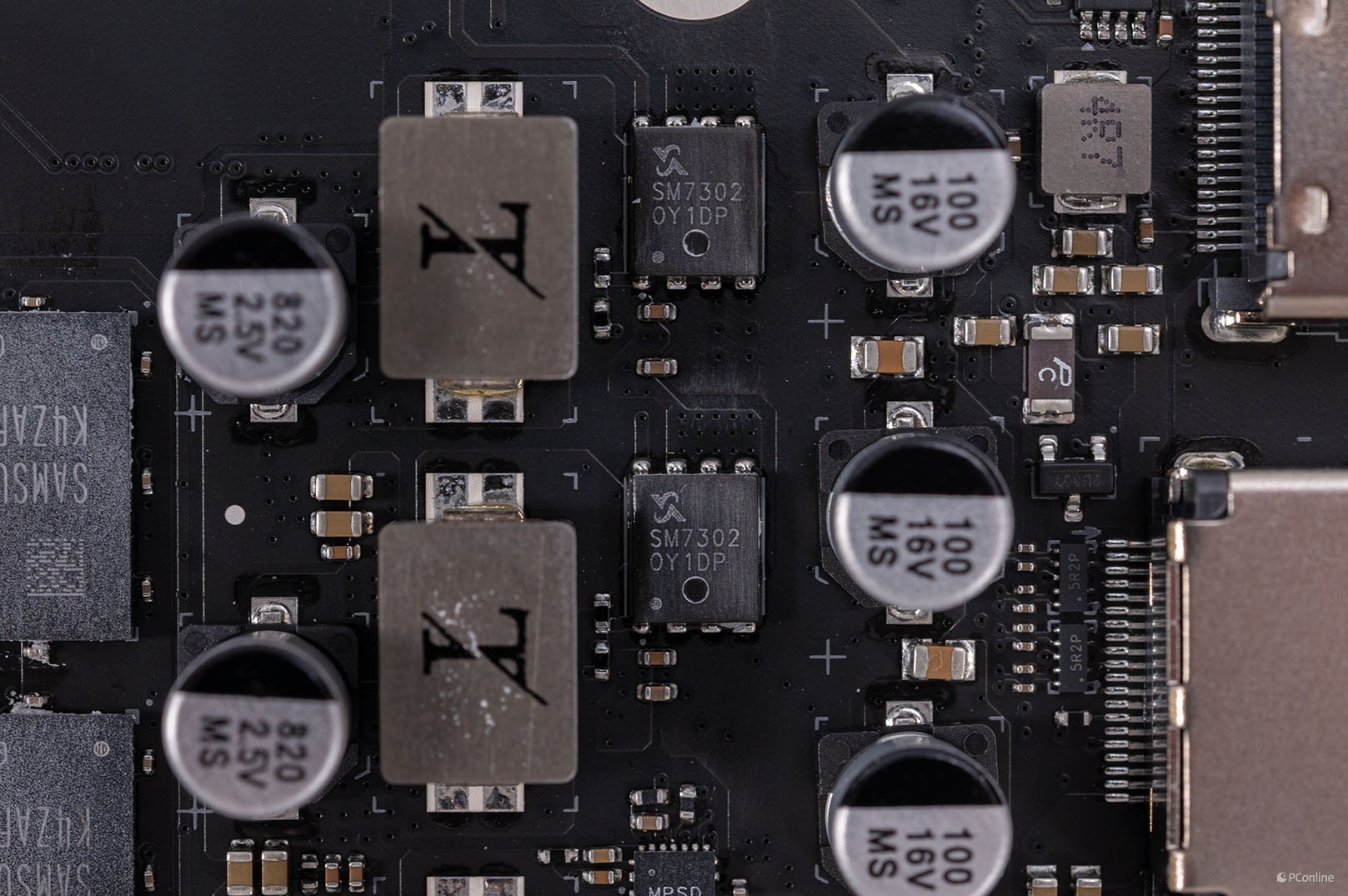 左侧为显存供电,DrMos芯片分别是SM7302与MPSD8694。