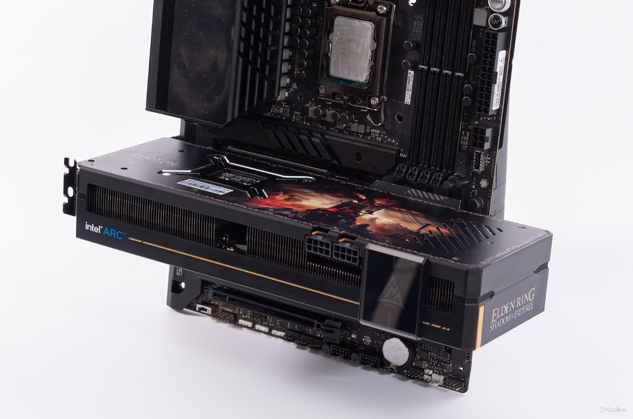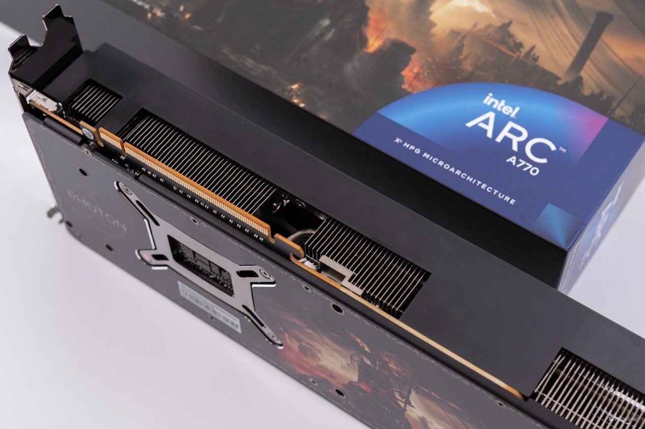底部还有显卡的金手指,它也是供电之一。并且值得一提的是主板必须支持 Resizable BAR 功能,才能充分释放蓝戟Intel Arc A770艾尔登法环联名款显卡的全部性能。