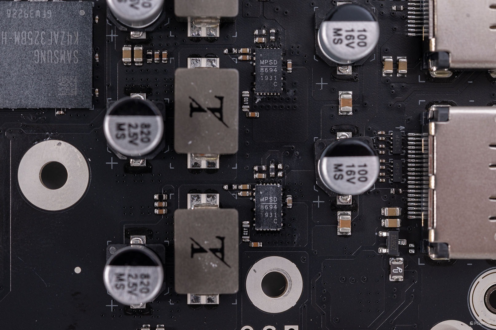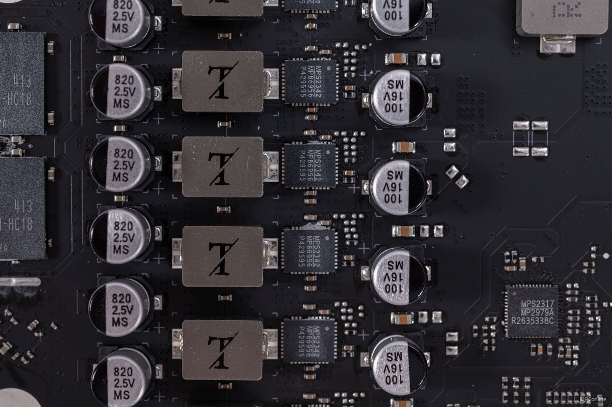 右侧是6相GPU核心供电,使用了MPS的DrMos芯片:MP86956,单颗最大输出电流值为70A,可以说供电规格与用料一点都不比其它主流级显卡弱。