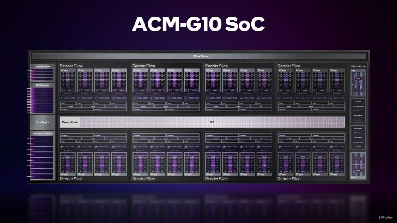 Xe HPG架构它的基本组成单元包括Xe内核、Xe媒体引擎、Xe显示引擎等,我们逐一来看。首先每个Xe内核包含16个矢量引擎和16个矩阵引擎,前者主要用来计算浮点或者整型运算,后者主要用来加速AI应用中常见的卷积和矩阵运算。而每4个Xe内核组成一个渲染切片,是Xe HPG架构中非常重要的组成部分,支持DX12 Ultimate、微软DXR和Vulkan RT的专用硬件光追单元。并且每个切片还配备了四个硬件光追加速器,用来实现硬件级的实时光线追踪。