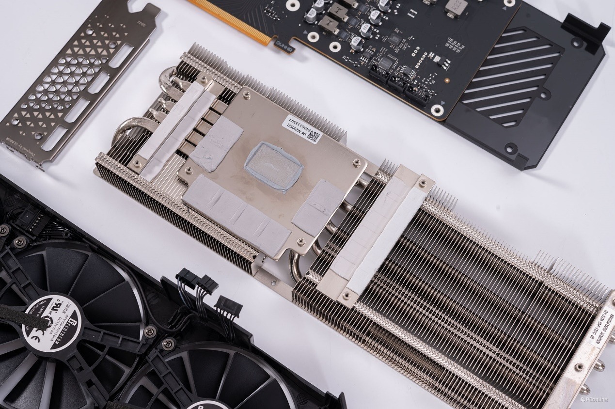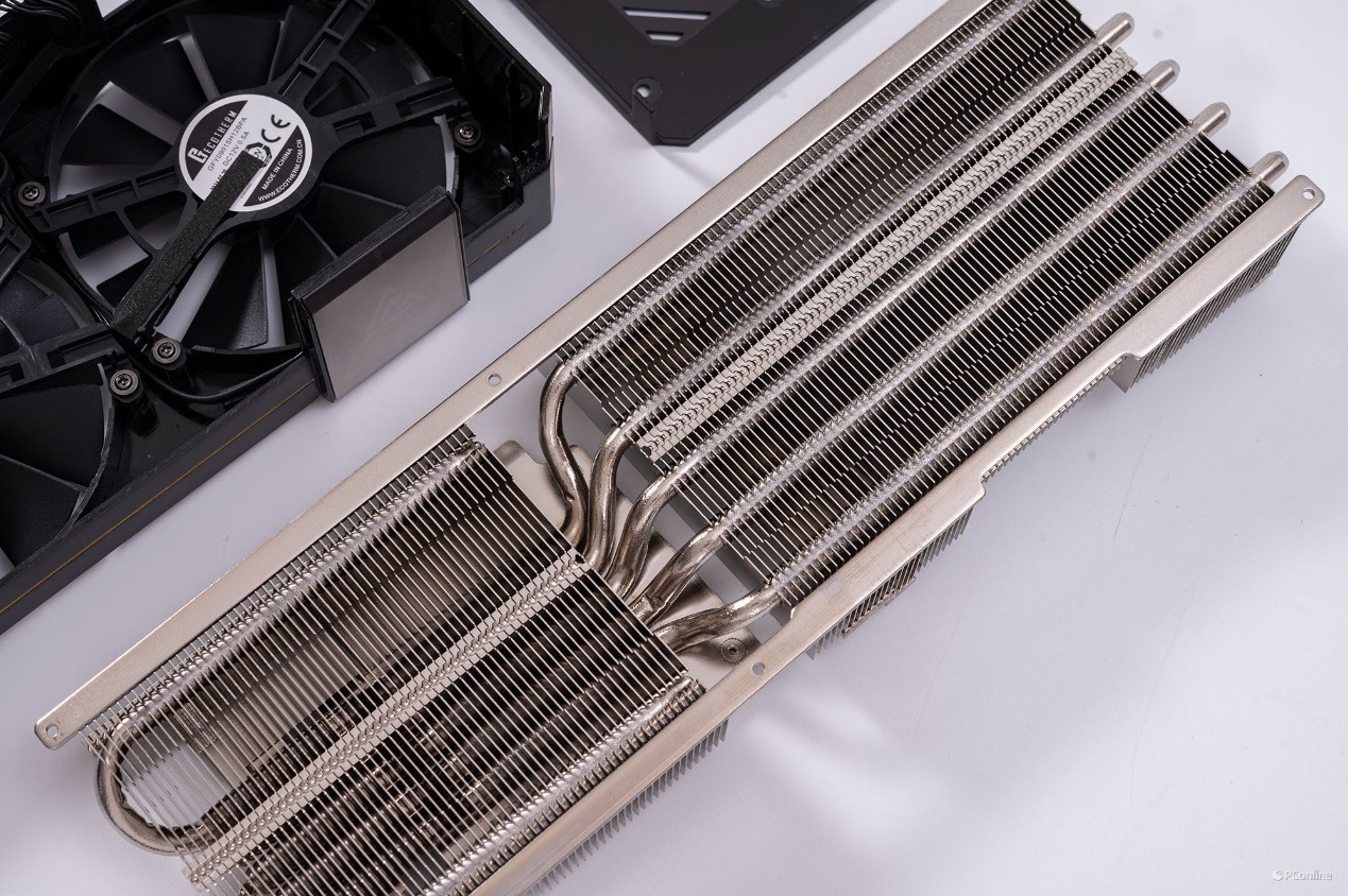 显卡的左右两侧是一整排密密麻麻的散热鳍片,隐约还能看到内部的热管,就这个散热规格来说,它的温控一定相当优秀。