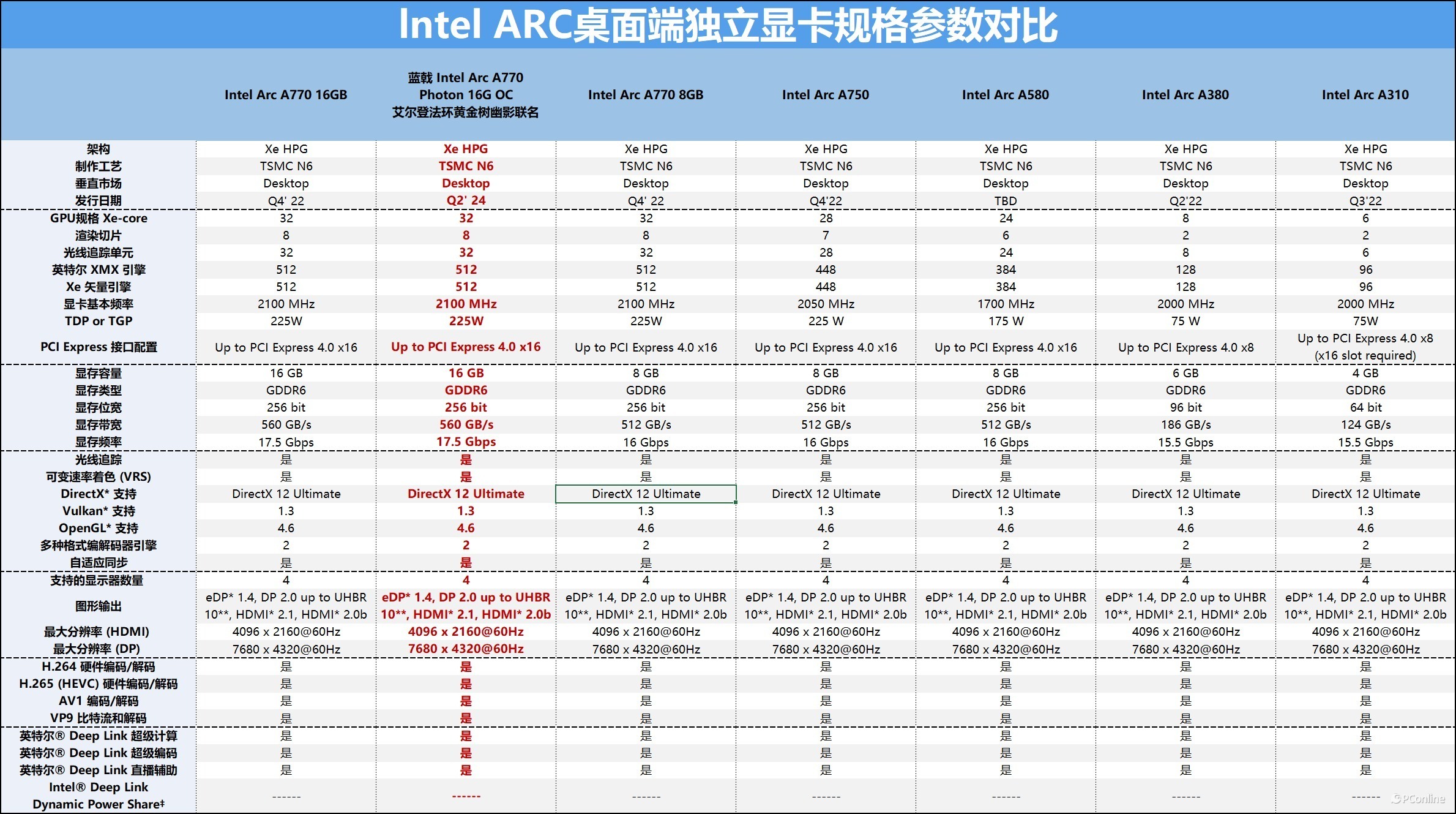 作为Arc 系列显卡中的一员,Intel Arc A770基于英特尔Xe HPG微架构打造而成,内置英特尔XMX AI加速引擎,专为DirectX 12 Ultimate优化的图形管线,专为加速当前和未来内容创作所需工作负载的全新Xe媒体引擎,支持DisplayPort 2.0定义的UHBR10的Xe显示引擎,以及支持英特尔Deep Link技术。