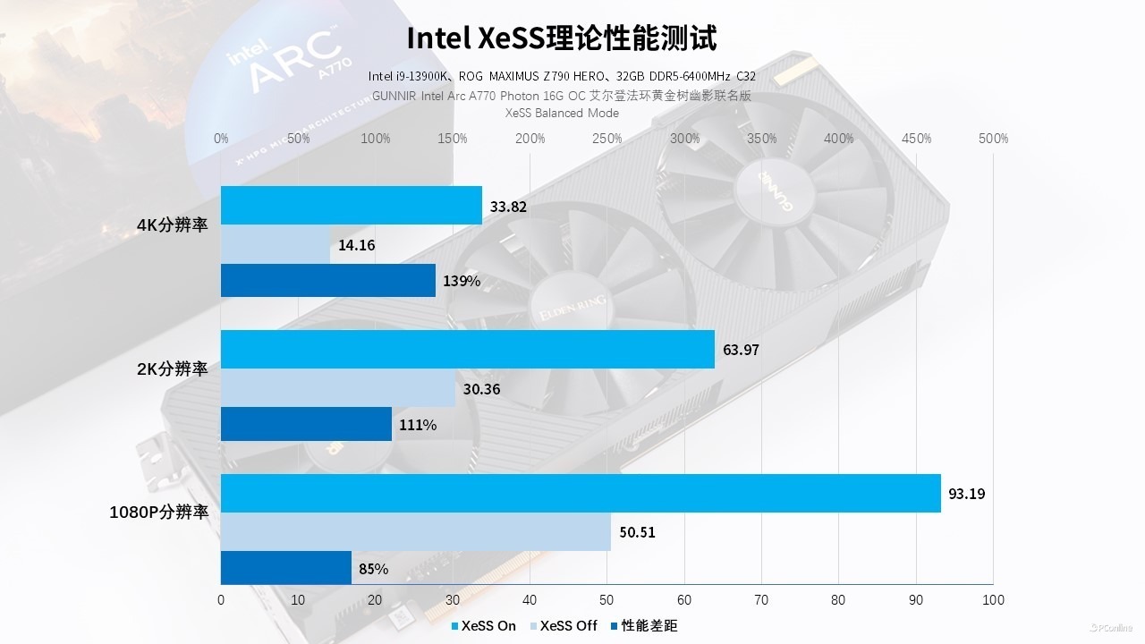 实测,常用的1080P档位下,蓝戟Intel Arc A770艾尔登法环联名款关闭XeSS仅有50 FPS,开启后则直接提升40 FPS,可以稳定1080P 90+ FPS运行。2K下,如果开启XeSS后,帧数可以去到63 FPS,相比没开XeSS的表现,是翻倍的提升,相当强势!4K则有些捉襟见肘了,不过考虑到这款显卡的定位与售价,2K才是它的主战场。