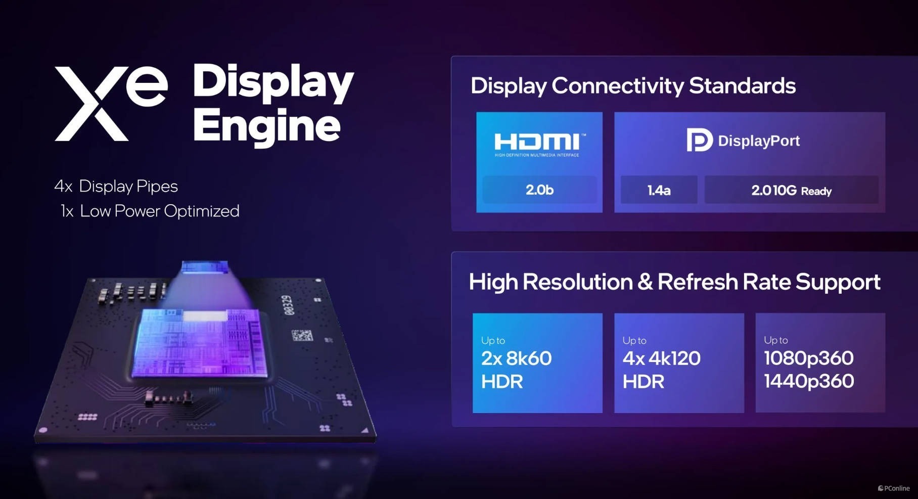 Arc系列全都配上了支持DisplayPort 2.0定义UHBR10的Xe显示引擎,Arc A770共带有4个显示通道,支持HDMI 2.0b、DisplayPort 1.4a,也兼容DisplayPort 2.0 10G。可以输出2条8K分辨率60Hz HDR信号或4条4K分辨率120Hz HDR信号,甚至2K分辨率下,还可以满足360Hz超高刷新率。