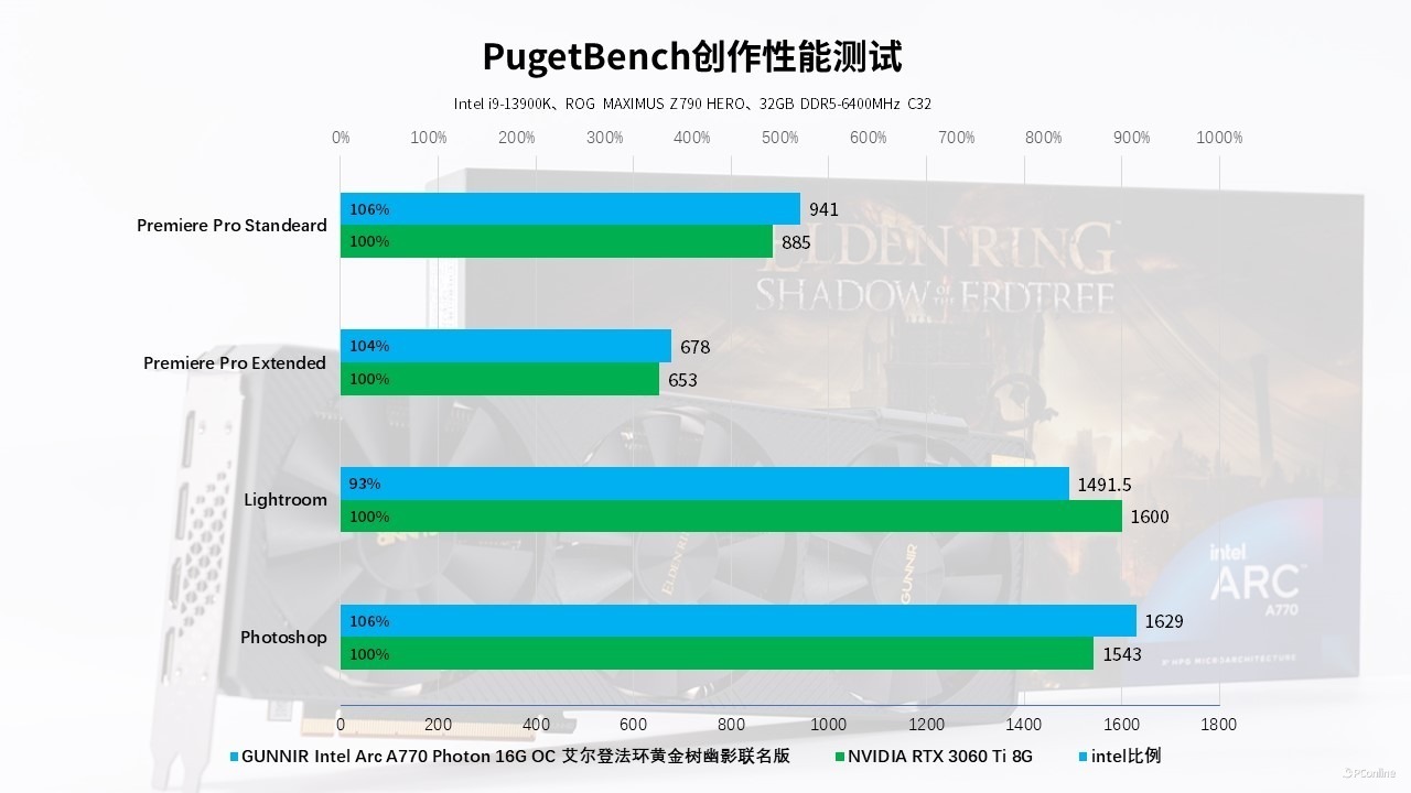 至于图像编辑、视频剪辑方面,我们则是用PugetBench进行测试,这个测试可以模拟Photoshop、Premiere等Adobe软件的实操,可以更准确的反映两款显卡的实际表现。实测蓝戟Intel Arc A770艾尔登法环联名款,在Adobe的软件里几乎是全面领先,领先幅度也是4-6%不等。