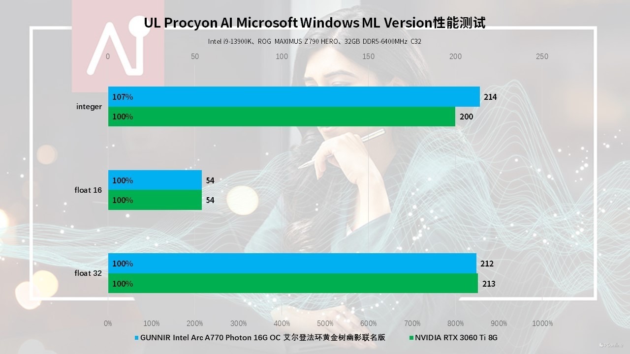 你可能好奇对比N卡的表现究竟如何?我们这里也是用UL Procyon的AIGC测试对两款显卡的AI性能进行了评估。测试项目选的是UL Procyon的Microsoft Windows ML version,测试了包含float32、float16以及integer三个部分。