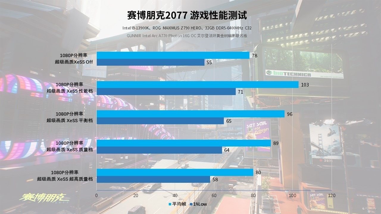 再看看XeSS在《赛博朋克2077》中的表现,1080P下,不开XeSS的情况下,游戏帧数为78 FPS,开启XeSS各个模式后,蓝戟Intel Arc A770艾尔登法环联名款的帧率都有所提高,在XeSS性能档下,相比关闭XeSS,帧数提升了25帧以上,而即使是平衡档,帧数也能提升20帧左右。
