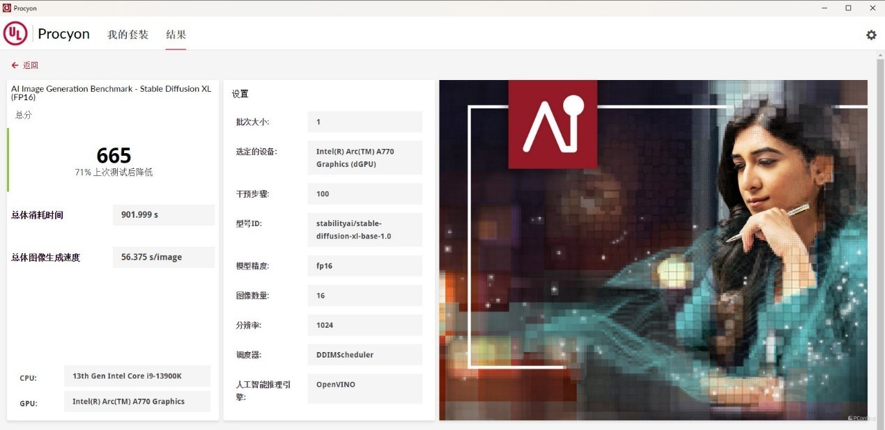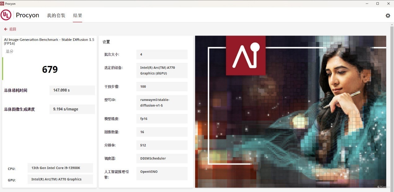 话不多说,我们先用UL Procyon测试一下,目前UL Procyon已经有AI文生图测试。蓝戟Intel Arc A770艾尔登法环联名款在SD 1.5模型下,生成速度为9.194秒一张图,测试得分679,表现还不错。