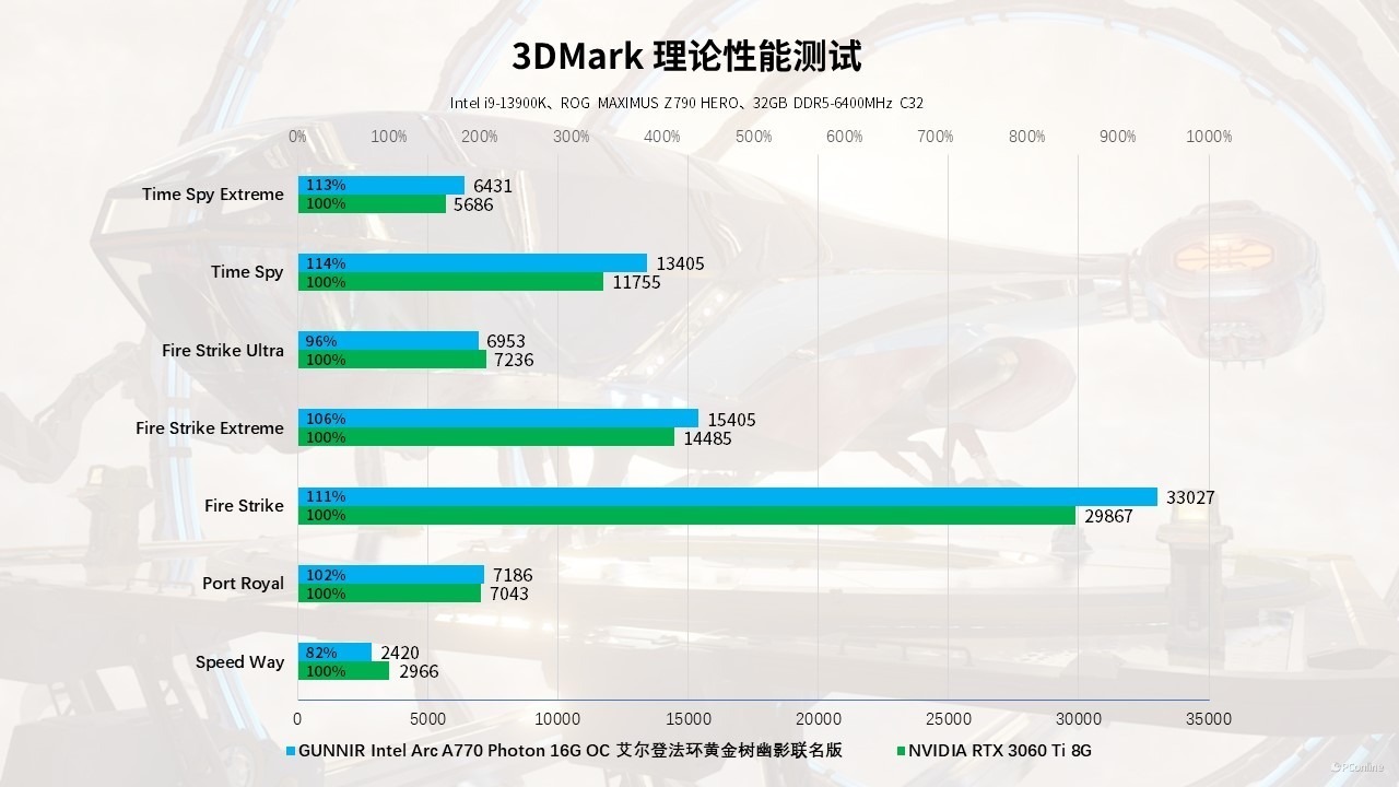 即便是压力巨大的光追项目Port Royal,蓝戟Intel Arc A770艾尔登法环联名款也不错,7186分稍稍领先了RTX 3060 Ti。