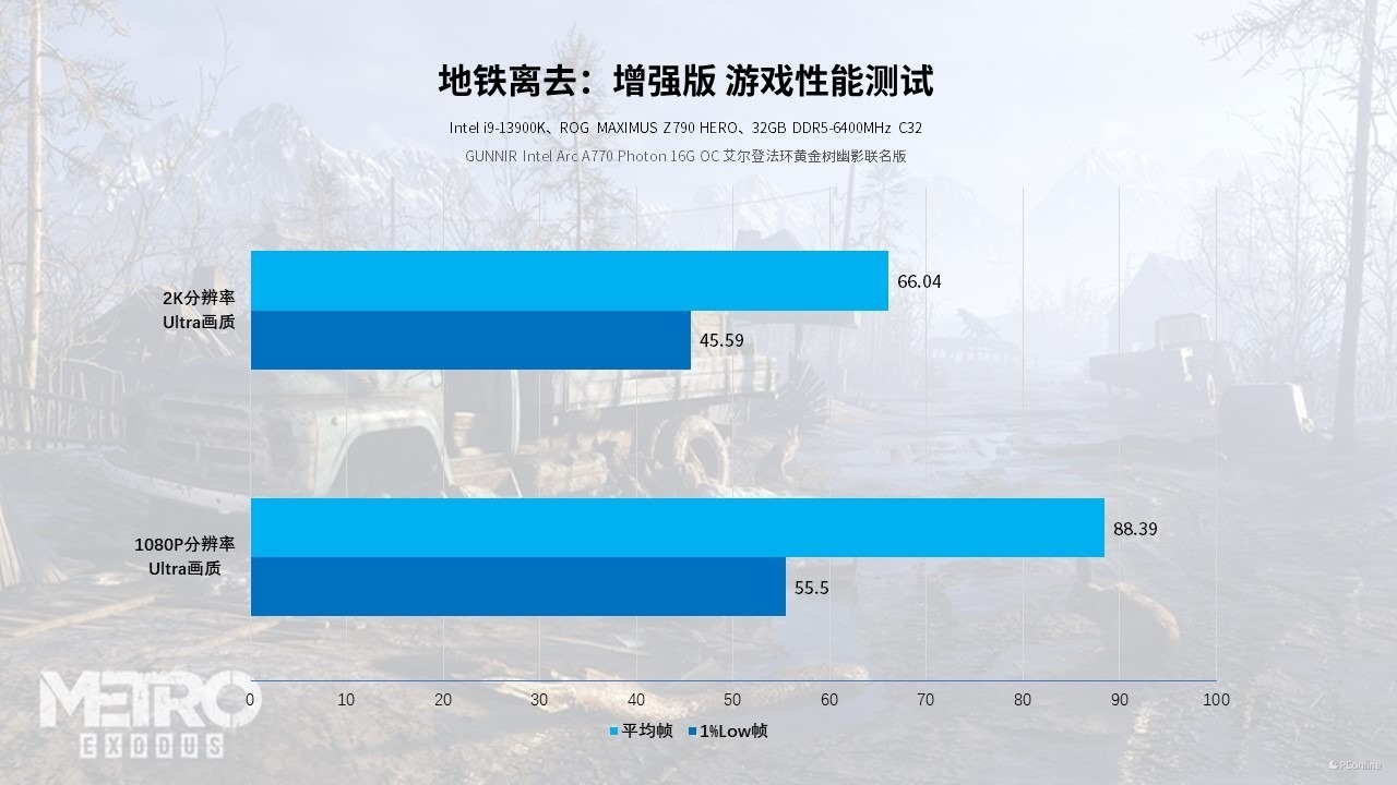 接着是压力巨大的《地铁离去:增强版》,原以为在这款游戏里,蓝戟Intel Arc A770艾尔登法环联名款就要败下阵来,毕竟没有XeSS加持。不过实测2K分辨率下,这款显卡依旧能够达成66 FPS,流畅游玩一点问题没有。