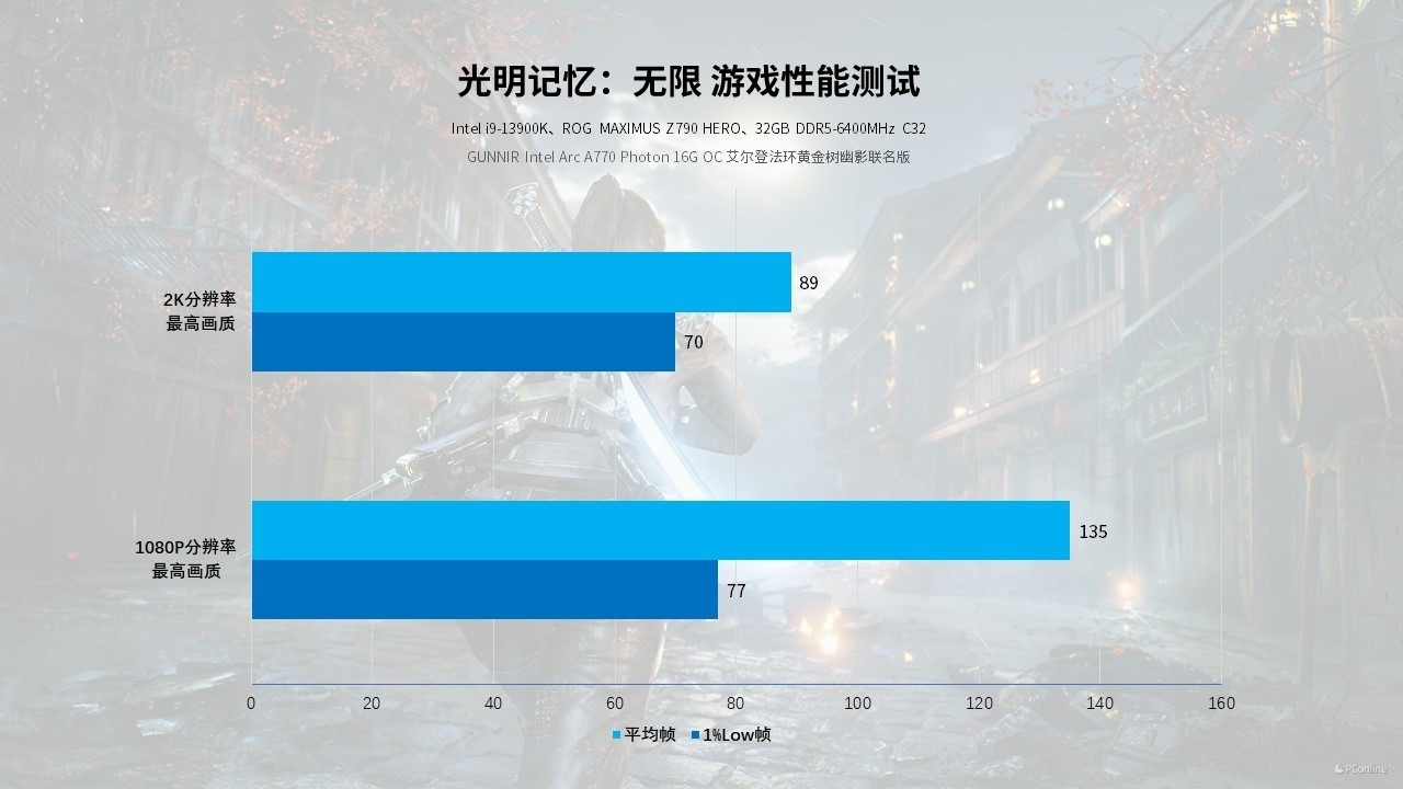 再试试FPS射击游戏,蓝戟Intel Arc A770艾尔登法环联名款更加强势,1080P分辨率下就有135 FPS的表现,2K分辨率也有接近90 FPS的体验。总的来说,将画质降低一档,甚至能够以电竞水准去玩3A。