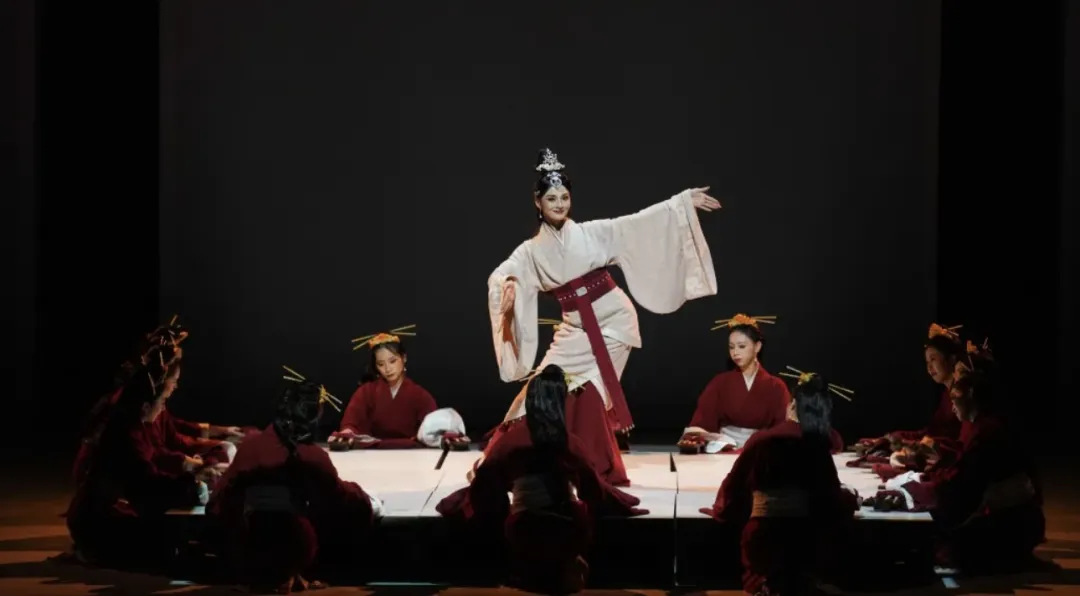 西施的代表舞段“响屐舞”队形变幻莫测、舞姿婀娜优美、音乐欢快跳脱。西施与众宫女脚蹬木屐、裙缀小铃,在不断铺陈变化的木板舞台上翩翩起舞。木屐与木板碰撞的回声“铮铮嗒嗒”,舞者裙上的铃铛“叮叮当当”, 相互交织成一支欢快的交响曲。这段舞蹈视频在各大平台火爆出圈,全网获得几十万点赞。