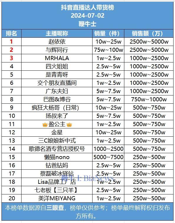 以下为7月2日抖音平台达人带货情况排名: