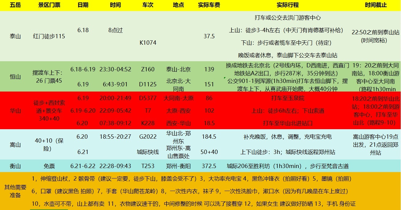 马女士目前在山东工作,今年30岁。她平时喜欢户外运动和健身,她从去年便得知了由五岳联盟发起的“五岳特种兵”100天打卡活动,但因为一些原因耽误了没有参加成功。在今年六月她特意请了年假来挑战此次活动。在出发之前,她在电子表格详细规划了每天搭乘的车次、实际行程安排以及费用,最后加上返程实际花费人均3852元。