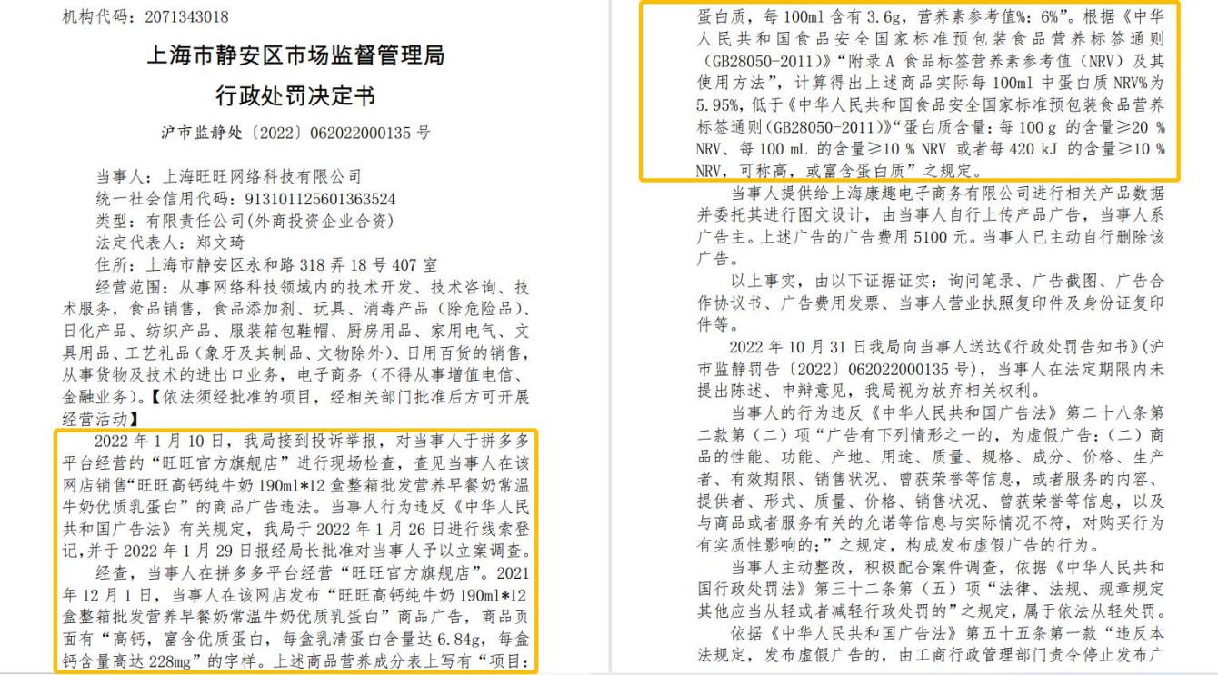 公开资料显示,2022年,上海旺旺网络科技有限公司(以下简称“上海旺旺科技”)就因其一款高钙奶未达到国家标准规定,而被上海市静安区市场监督管理局处罚。按相关规定,每100ml牛奶中的蛋白质含量≥10%NRV,可称高或富含蛋白质,但旺旺该款牛奶中的蛋白质含量为5.95%NRV,与规定不符。