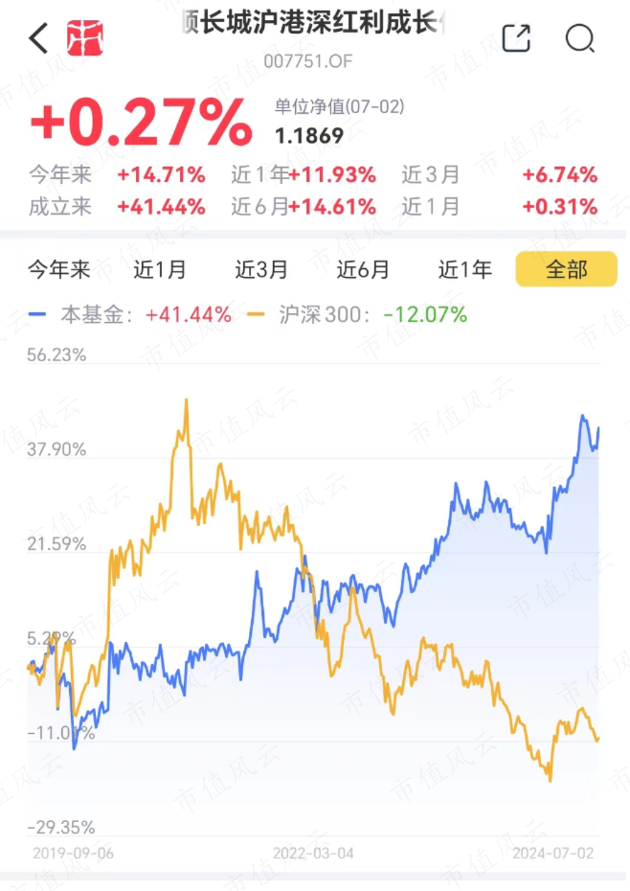 该基金自2019年9月运作至今,年化回报率达7.5%,其中最近两年收益率相当不错,2023年净值上涨7.8%,2024年初至今已经上涨14.7%。