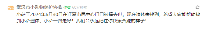 7月3日,此前参与转发扩散的武汉市小动物保护协会微信号在寻狗推文的评论区发布消息称,小萨已被撞去世,还未找到遗体。