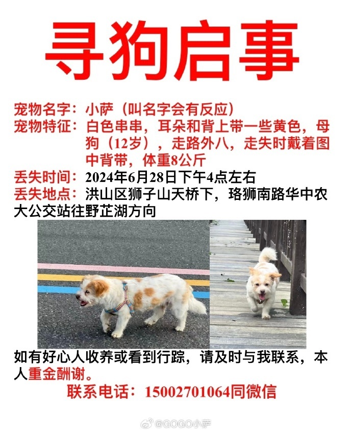 6月29日,萨爸在社交平台发布求助信息,称小萨于6月28日下午4点左右在武汉市洪山区珞狮南路华中农业大学公交站丢失,这个消息牵动了众人的心,也有很多人转发希望找到线索。
