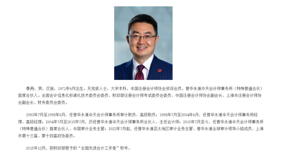 据中国注册会计师协会官网信息,李丹于1971年6月出生。无党派人士,大学本科,中国注册会计师协会资深会员。普华永道中天会计师事务所(特殊普通合伙)首席合伙人。全国会计信息化标准化技术委员会委员、财政部注册会计师考试委员会委员、中国注册会计师协会副会长、上海市注册会计师协会副会长、财务委员会委员。