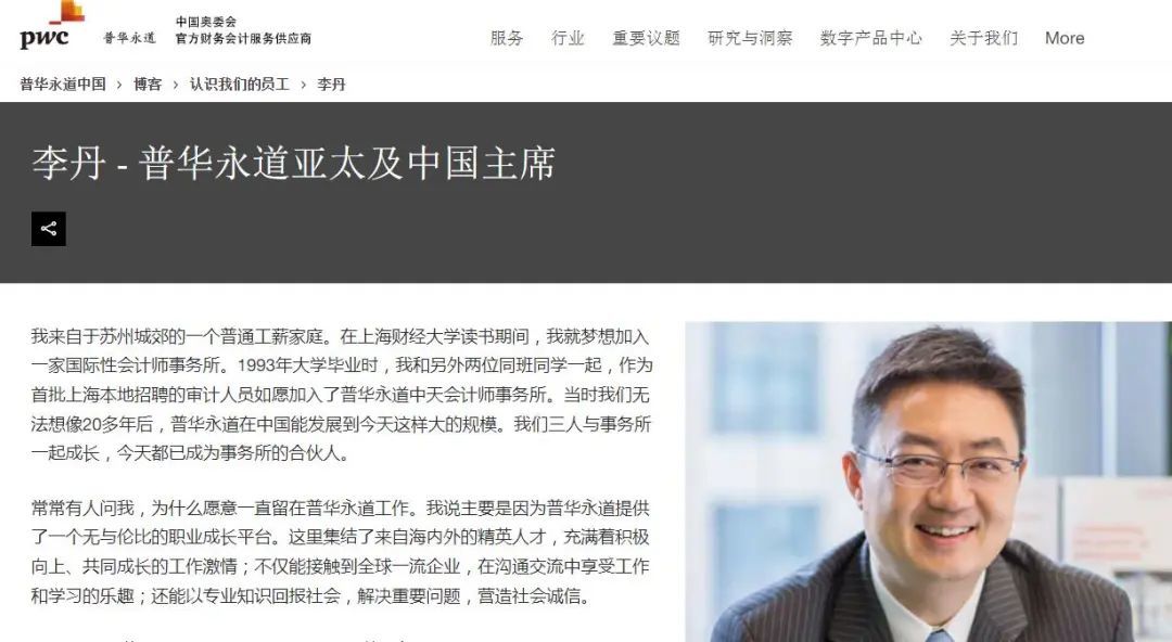 据普华永道中国官网,李丹是首位领导国际四大专业服务公司在华业务的中国内地人士。