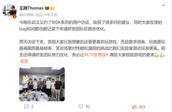 【CNMO科技消息】7月3日晚间,CNMO注意到,小米中国区市场部副总经理兼Redmi品牌总经理王腾,在最新发布的动态中分享了与武汉地区8位K系列用户的深入访谈经历。此次交流不仅收集到了众多宝贵的用户建议,还详细记录了用户反馈的各项bug及性能问题,承诺将迅速传达给研发团队进行针对性优化。