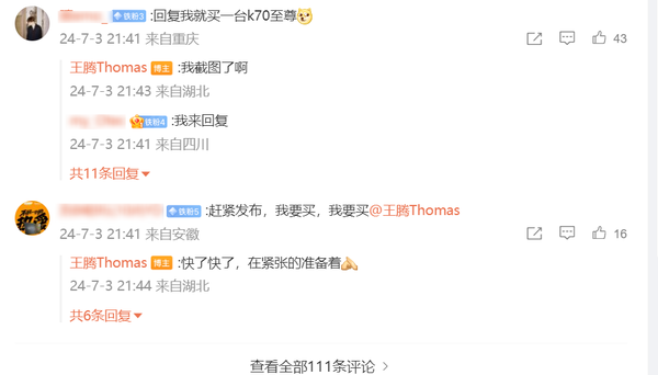 值得注意的是,王腾此次发言的微博小尾巴悄然换成了小米手机,间接透露了他可能已率先体验了Redmi K70至尊版,进一步证实了该机型即将面世的消息。据多方预测,Redmi K70至尊版有望在七月上旬正式亮相。