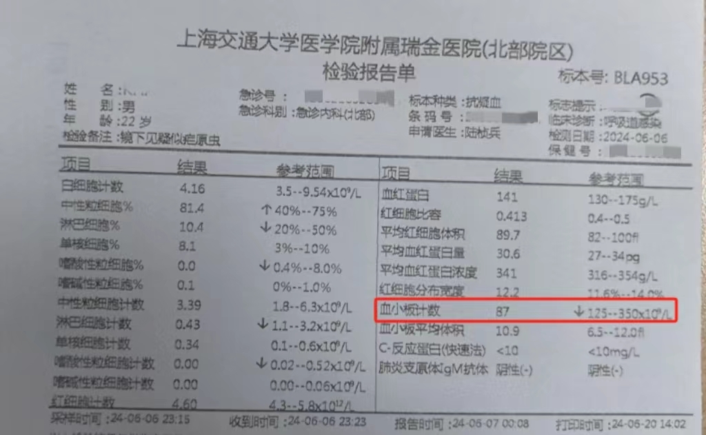 近来,一天深夜11点多,一名年轻患者赶到上海瑞金医院北部院区急诊。他已经连续发烧2天了,体温最高为37.7℃,伴随着头痛和咳嗽,不规则发冷发热症状。当班医生在常规检查中看出一个不寻常的现象,认为这不是简单的发烧。