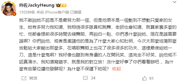向佐写道:“我不敢说她是不是最努力那一个,但是她原本是一个动到不想动只爱家的女生,她有多努力我知道,我相信很多队员和跳舞老师也会知道,就算家里多么的忙,她都会提前很多时间去练舞蹈。再说白一点,你们凭什么说她,现在是谁需要谁啊?你们说她或者是邀请她的是为了什么大家心知肚明。她那么坦荡那么放松给大家输出那么多,在唱歌舞蹈上也花了很多很多的功夫,这样最后给她一刀,这是什么鬼啊?我好像也听到有身边的人在开玩笑,这完全不好笑,说她不认真划水。没什么好事了,你们看着办吧,为什么让它发酵呢?为什么不保护下她呢?”
