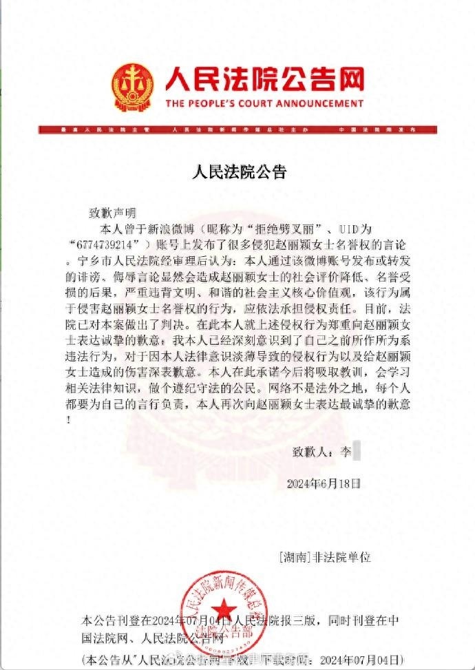 7月4日,北京星权律师事务所发布案件简讯:2024年7月4日,赵丽颖女士诉李*(微博UID:6774739214)名誉权纠纷案被告李*依据(2024)湘0182民初1484号生效民事判决书,在《人民法院报》刊登致歉声明向赵丽颖女士公开致歉。