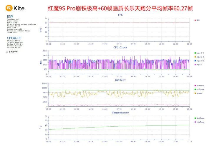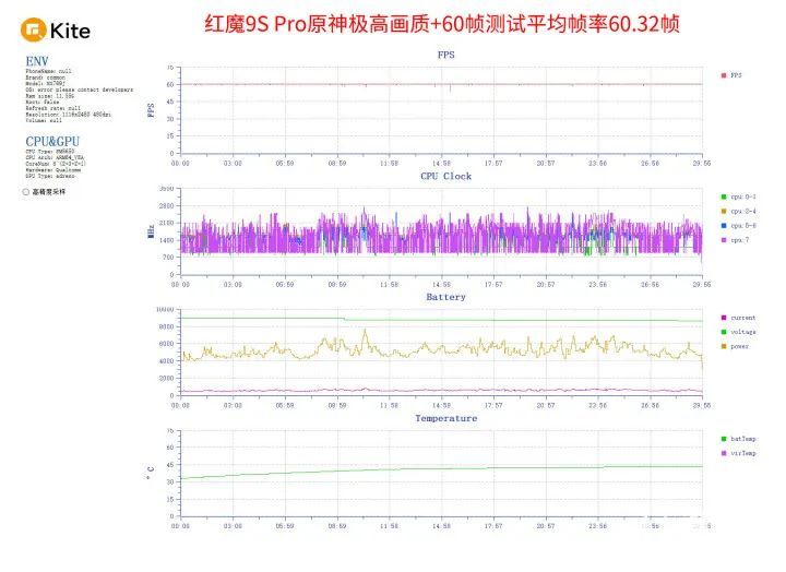 接下来看游戏实战,首先是《原神》默认837P分辨率,开启极高画质,手动将游戏调整为60帧,30分钟游戏下来,红魔9S Pro的平均帧率为60.32帧,游戏全程十分稳定,帧率曲线让人看着十分舒适,几乎是一条直线,也代表着全程没有帧率波动,这点是很多高性能手机做不到的。