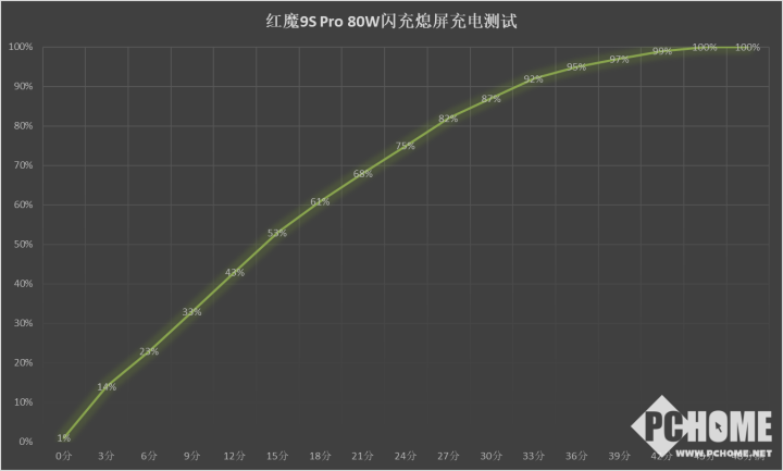 在快充实测上,红魔9S Pro熄屏充电15分钟充至53%,30分钟充至87%,43分钟UI显示100%电量,48分钟完全充满。对于6500mAh大容量电池,这个充电速度已经令人十分满意了。