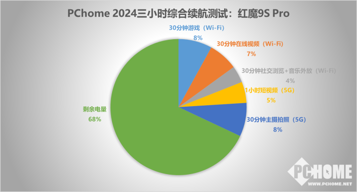 3小时续航实测,剩余电量68%,目前位居2024年已测机型的第5位,续航表现相当强。我们注意到,在游戏方面的耗电量为8%,换算下来的话,至少能提供连续6小时的游戏连续游玩,连续一个下午的游戏时间,续航肯定不是问题了。