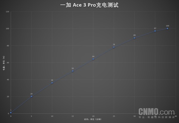 我们将一加 Ace 3 Pro从电量1%开始充电直至充至100%,并且每5分钟记录一次充电情况,最终将充电过程绘制成充电曲线。充电条件是:使用一加 Ace 3 Pro在当前室温下使用手机原装的100W超级闪充头和数据线在息屏状态下进行充电。能够看出,一加 Ace 3 Pro的充电曲线是非常平滑的,最开始的5分钟充电速度最快,充进了19%,之后的时间里,基本上每5分钟充电15%左右,15分钟充电至50%,最终耗时38分钟充至100%。平滑的充电曲线也说明一加 Ace 3 Pro的100W闪充几乎全能都是高功率充电的,而不是像一些产品那样只是在某个时间段高功率,这种均衡的充电功率让消费者在体验时会更好。