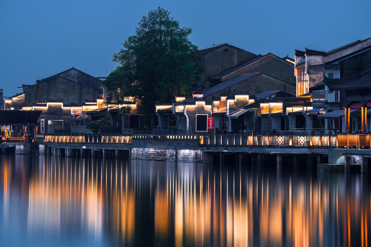 夕阳的余晖洒满古镇,夜幕悄然降临,靖港又换上了另一副迷人的面容。沿河而行,只见灯光逐一亮起,将靖港古镇装点得如梦似幻。漫步在灯火阑珊处,晚风拂面、星月临空,河水倒映着两岸的古建筑和五彩斑斓的霓虹,如同徜徉在一幅流动的画卷之中,使心灵得到彻底的放松与洗涤。