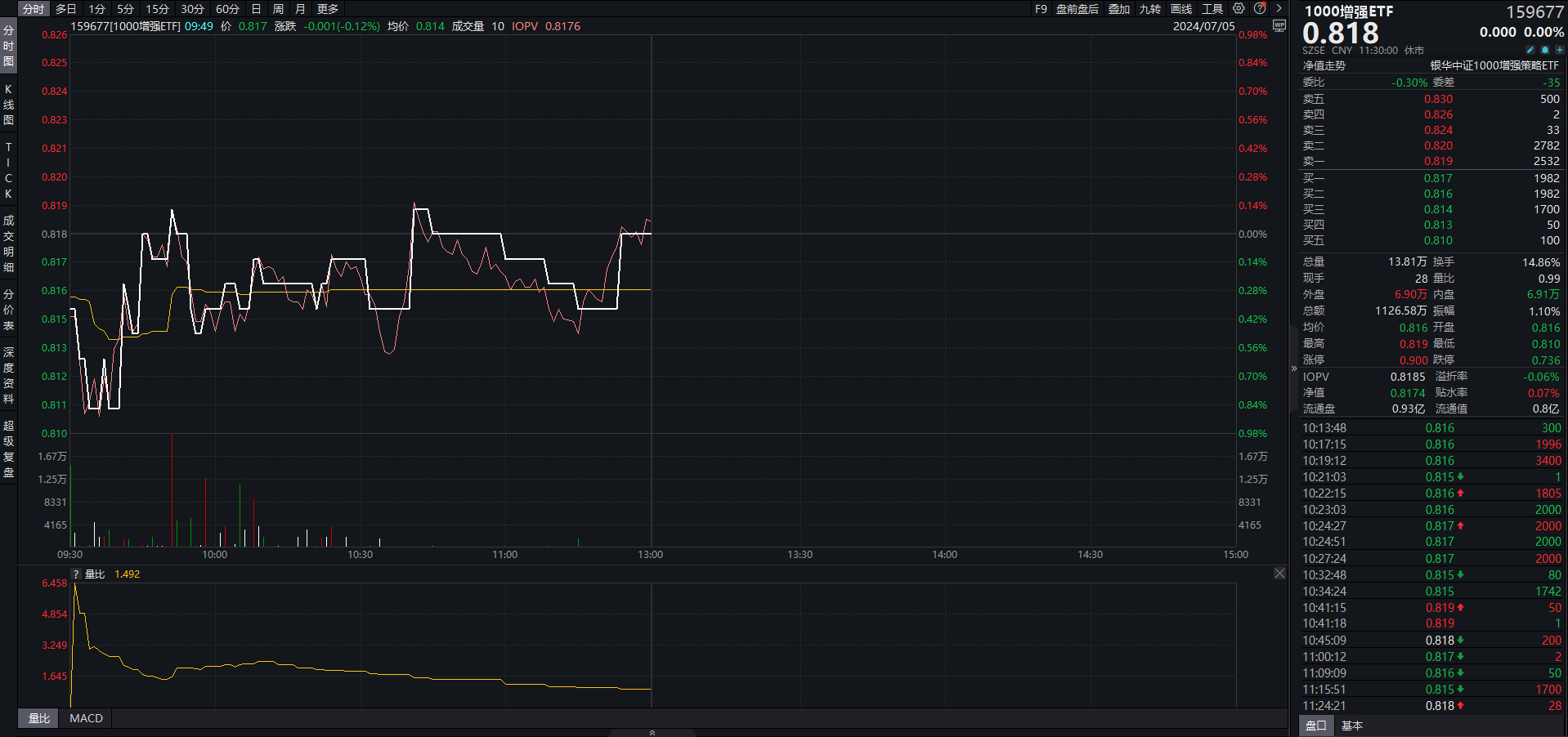 相关ETF方面,1000增强ETF(159677)早盘平收,成交额超1100万元,换手率近15%,盘中交投活跃。
