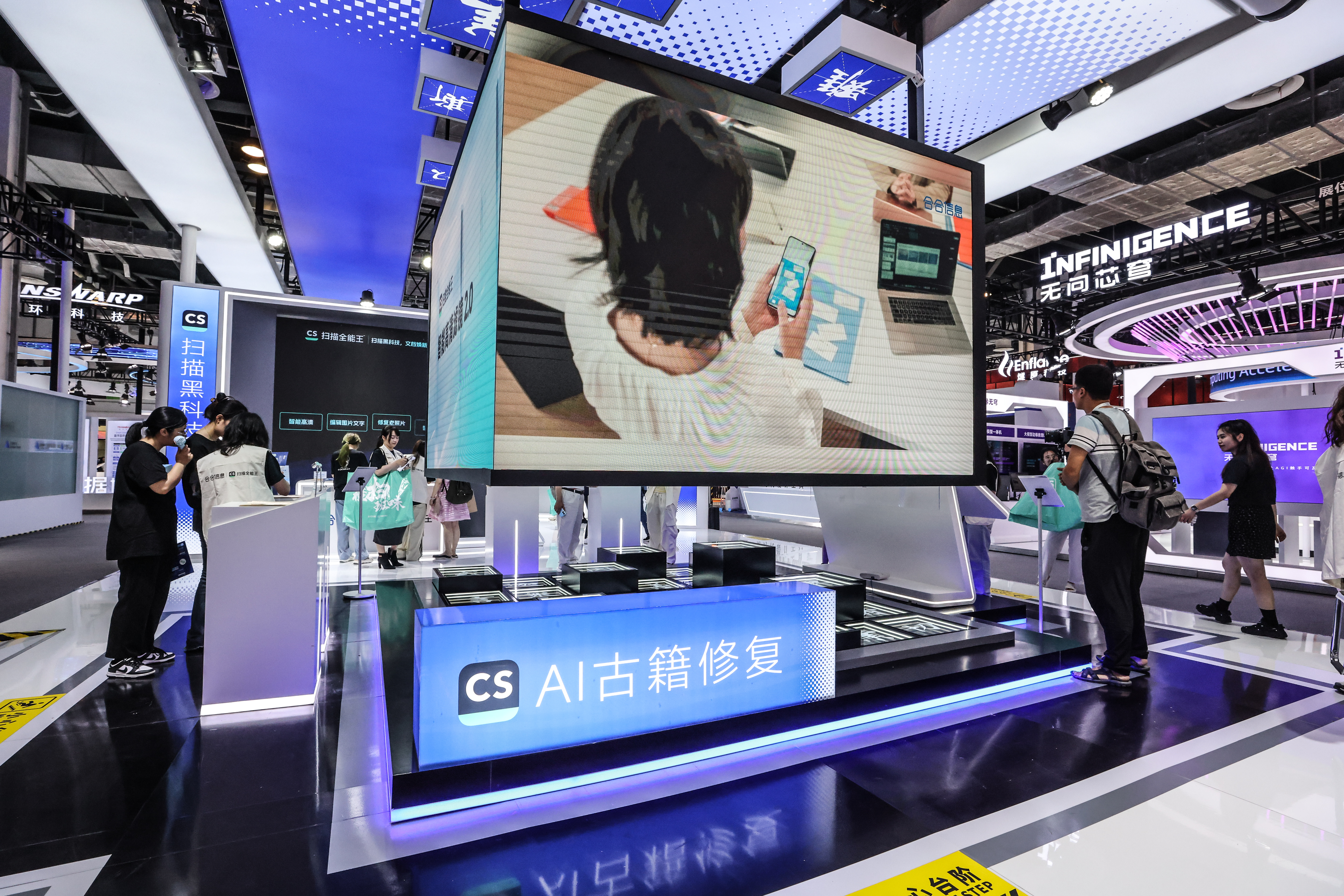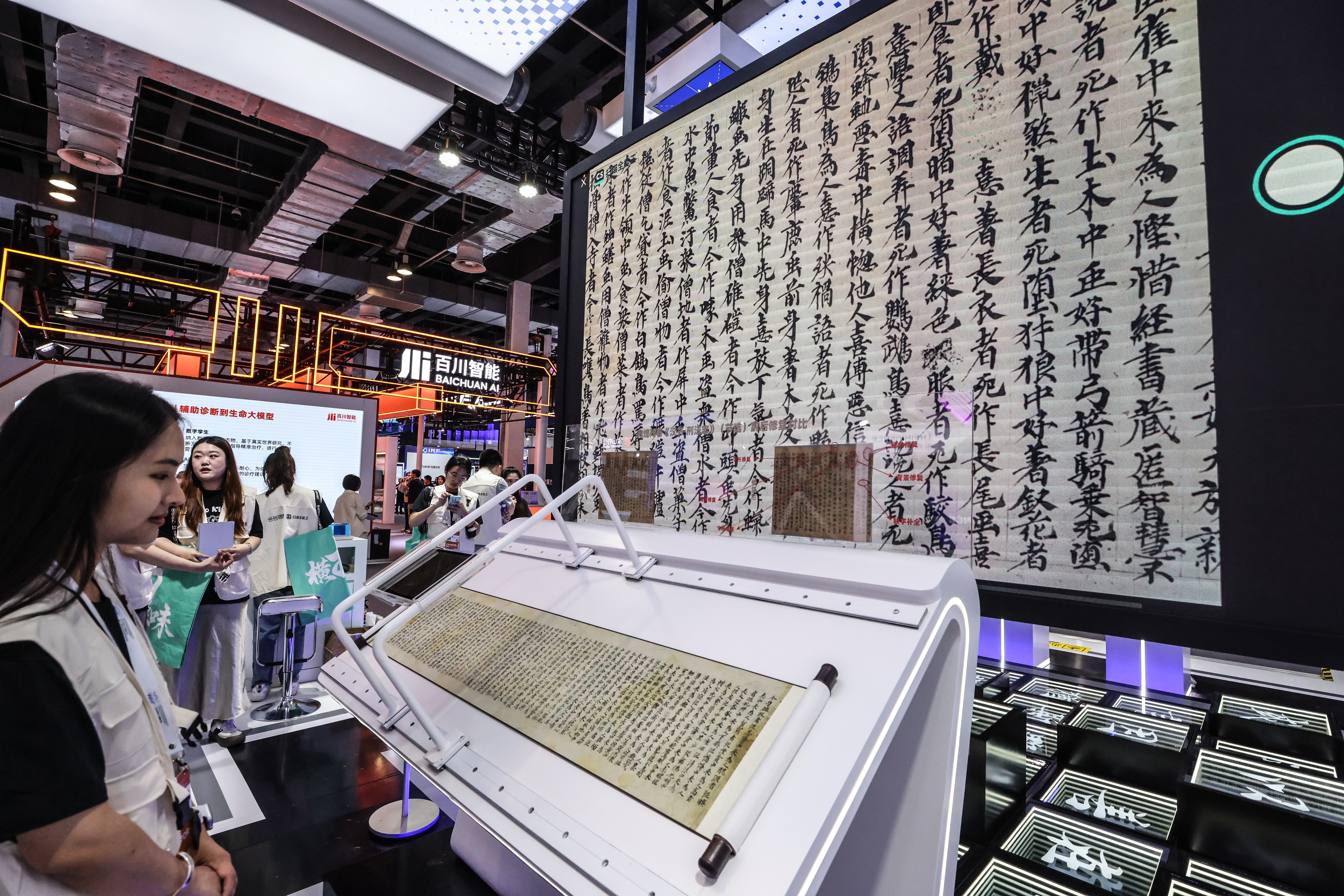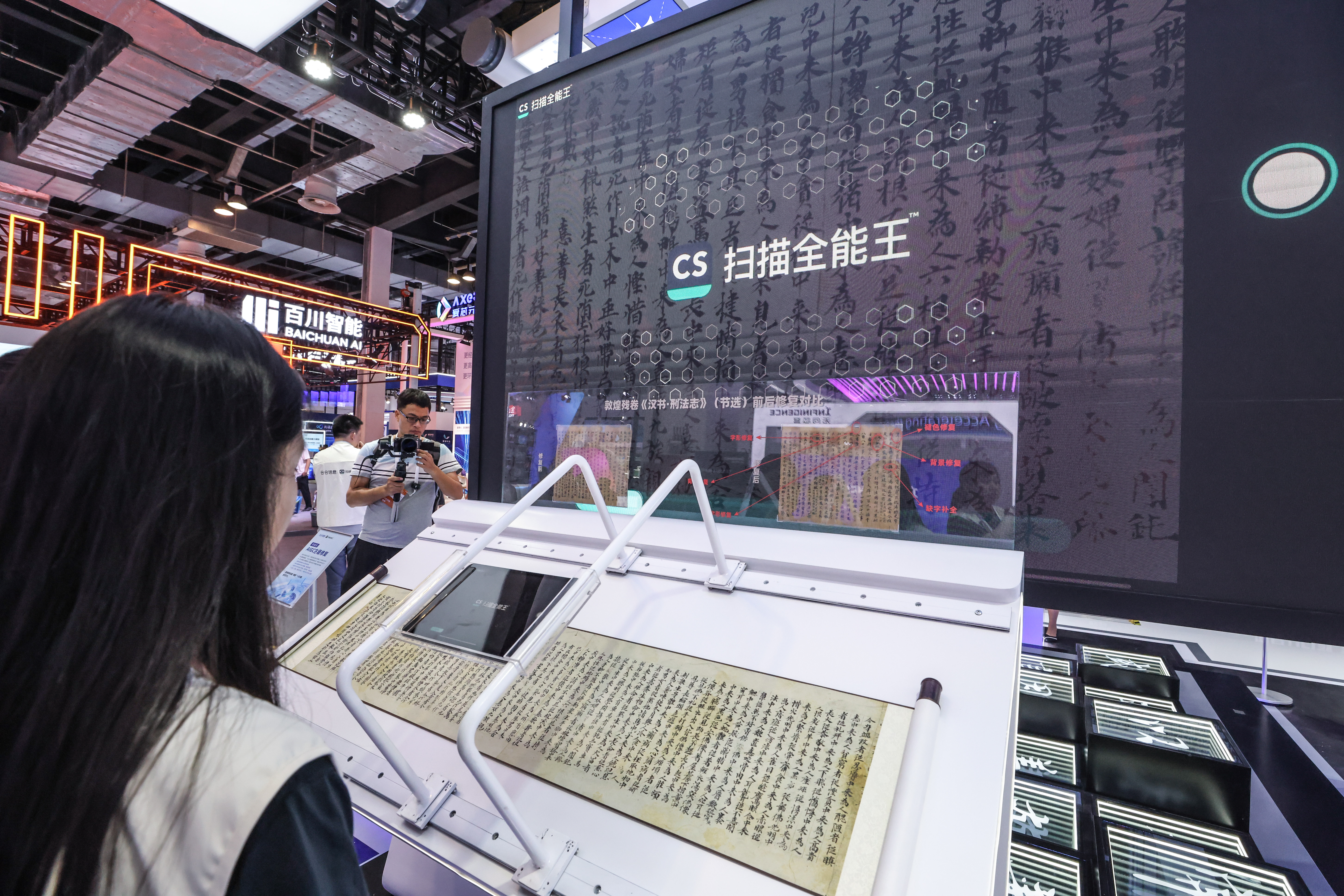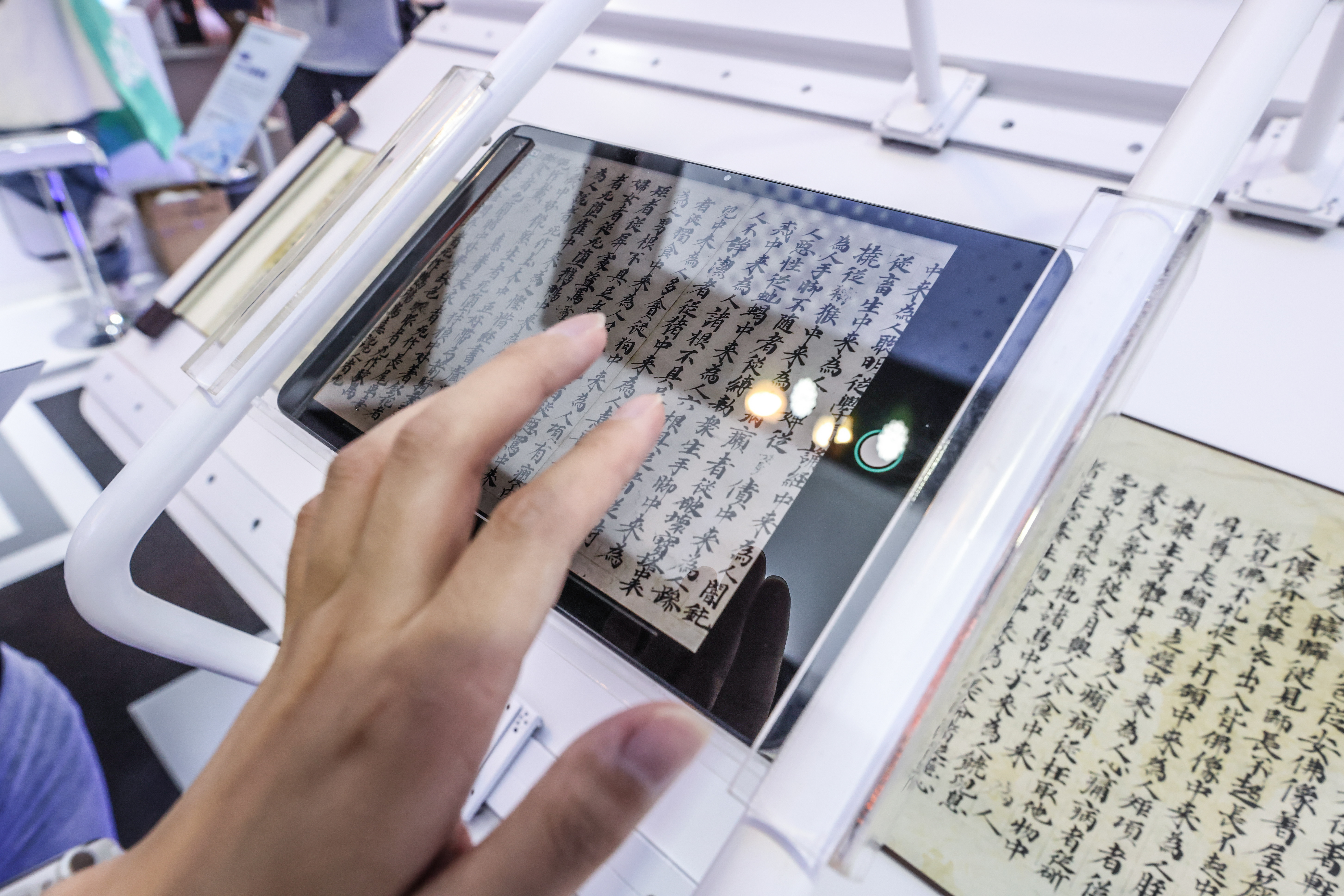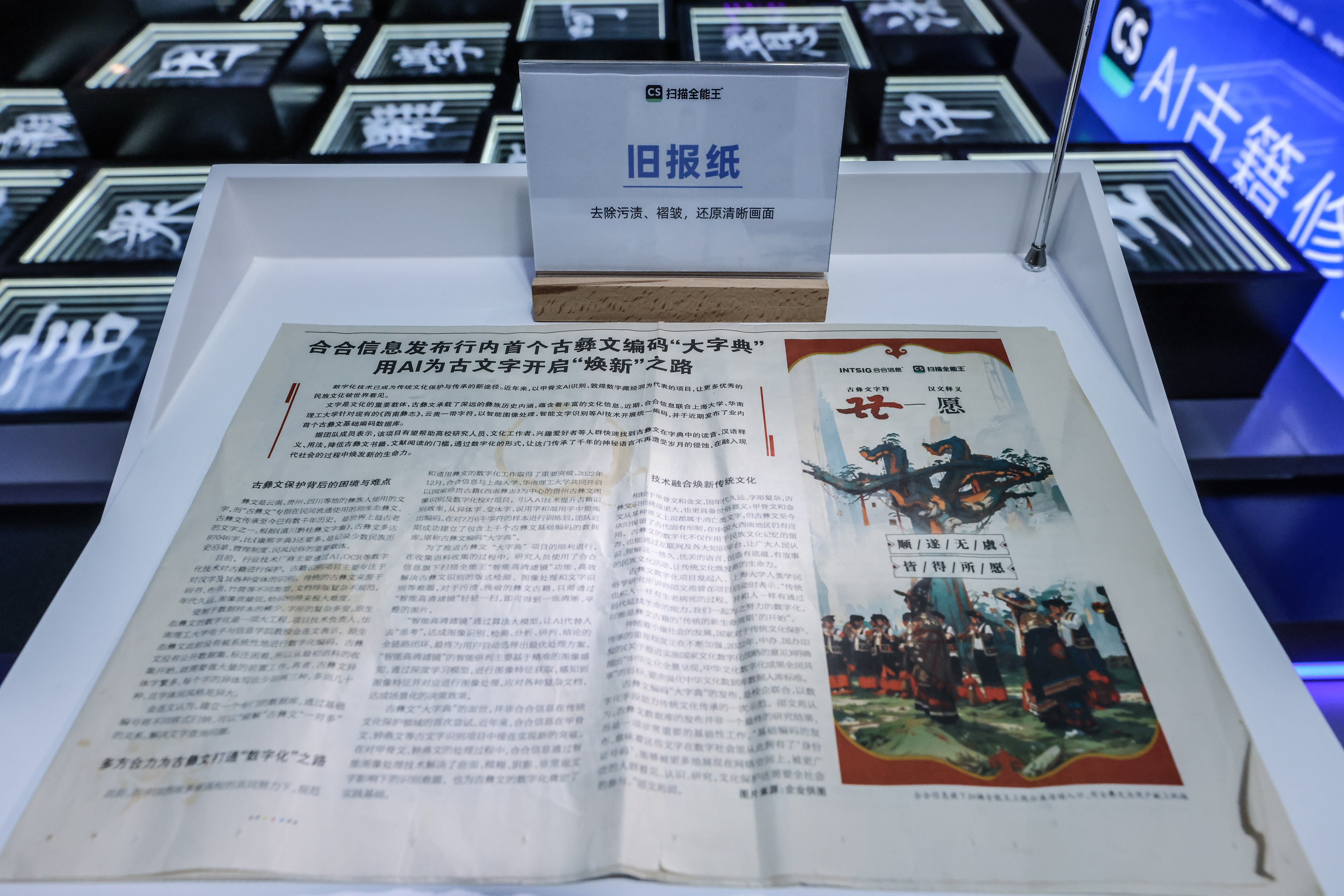 据了解,合合信息展位在本次大会期间开放了敦煌遗书合成样本的文字修复体验项目,公众可在不同位置扫描样本卷轴,见证AIGC技术通过字形修补、褪色修复、背景补全等方式,让残损的古籍焕发新的生命力。