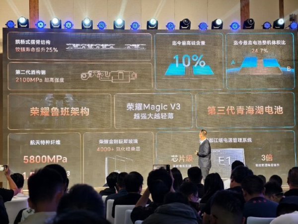 据CNMO了解,荣耀Magic V3将首发搭载第三代青海湖电池。官方介绍称,该电池硅含量在行业内首次跨越10%的门槛,并实现了惊人的24.7%电池整机体积比。荣耀还自主研发了能效增强芯片HONOR E1及都江堰电源管理系统,两者协同工作,精准调控能耗,确保在多样化的使用场景下,用户都能享受到超长待机的便利。