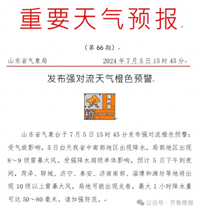 山东省气象台于7月5日15时45分发布强对流天气橙色预警:受气旋影响,5日白天山东省中南部地区出现降水,局部地区出现8~9级雷暴大风。受强降水超级单体影响,预计5日下午到夜间,菏泽、聊城、济宁、泰安、济南南部、淄博和潍坊等地将出现10级以上雷暴大风,局地可能出现龙卷,最大1小时降水量可达50~80毫米。请加强防范。