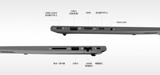 作为一款商用笔记本电脑,昭阳X5-14 AHP 还提供了几乎全场景的功能接口,包括双全功能Type-C接口(其中一个接口为USB4 40Gbps),双USB-A接口(左侧的支持关机充电),HDMI接口,RJ45千兆有线网络接口,3.5mm音频插孔,此外还有一个多合一读卡器,以及针对商务公共区域放置的电脑锁孔。丰富的接口可以轻松扩展,连接更多外设。