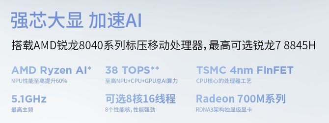 锐龙8040系列处理器配备了RDNA3架构的Radeon 700M系列独显级内置显卡,以及AMD Ryzen AI技术支持的NPU。这使得笔记本在图形处理和AI应用方面表现出色。尤其是NPU的性能提升显著,与上代锐龙7040系列相比,提升幅度高达60%,也使得锐龙7 8845H综合NPU+CPU+GPU的混合AI算力达到了38 TOPS,为办公场景中的AI应用提供了强大的支持。例如,在文档处理、视频会议、语音识别、智能推荐等方面,AI引擎可以加速这些任务的执行,减少等待时间,从而提升办公效率。