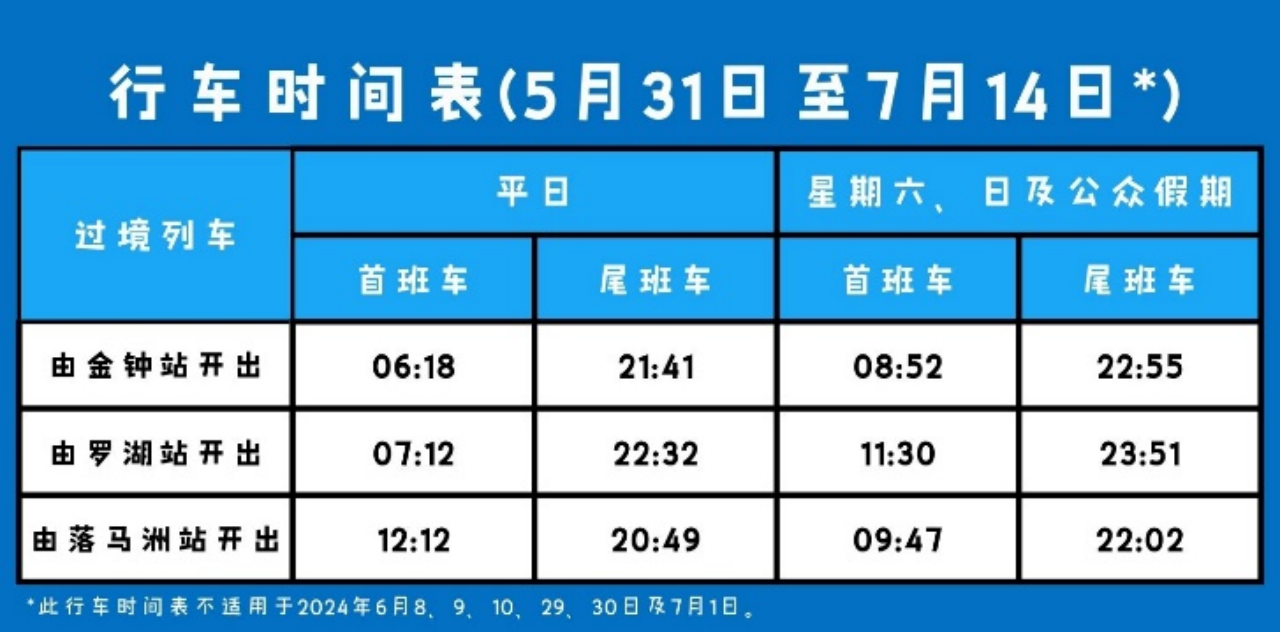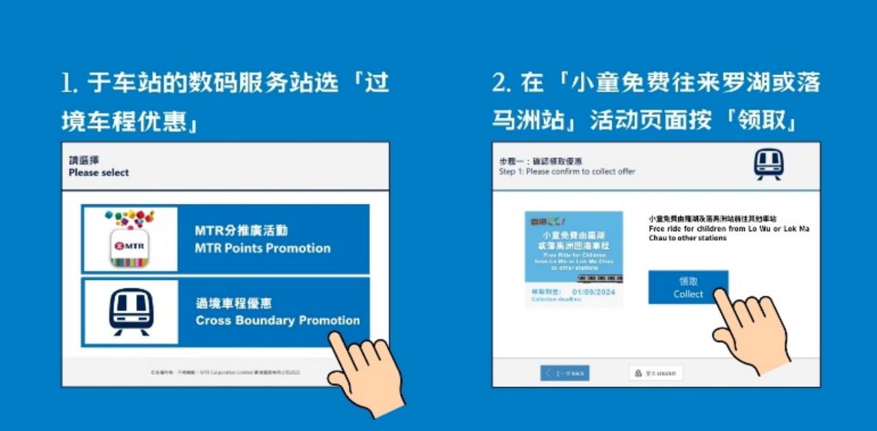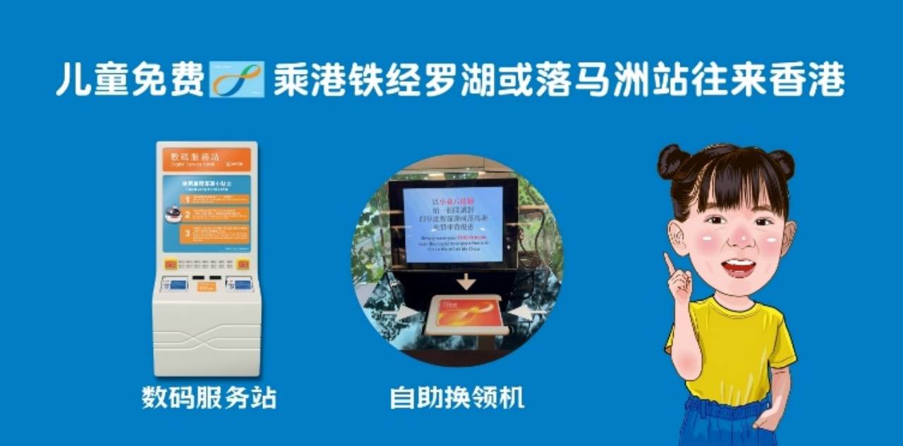 2024年7月3日至9月1日期间,3至11岁的乘客于每次进闸乘车前凭小童八达通,到港铁站内非付费区的数码服务站或自助换领机,可领取免费过境车程往来罗湖站或落马洲站(不包括机场快线及轻铁)。记得在进闸前领取小童免费过境优惠!