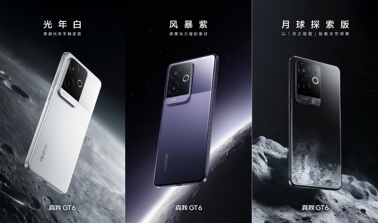 回顾一下关于真我GT6 的预热信息,配色上除了拥有「光年白」、「风暴紫」两款配色,还有独特的月球探索版,以「月之暗面」致敬太空探索。屏幕采用首发的京东方 S1+ 旗舰直屏,峰值亮度高达 6000nit,体验全面优化。