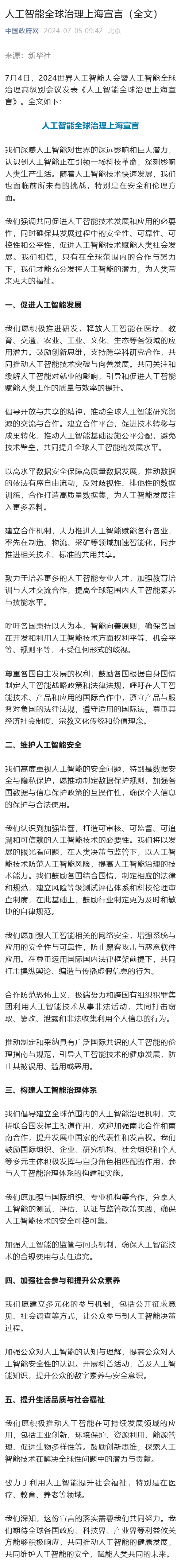 7 月 5 日消息,据新华社报道,7 月 4 日,2024 世界人工智能大会暨人工智能全球治理高级别会议发表《人工智能全球治理上海宣言》(下称《宣言》)。