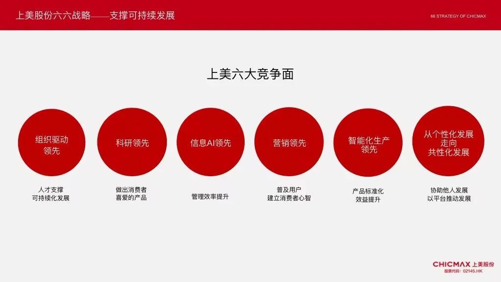 在未来十年内,通过组织驱动领先、科研领先,信息AI领先,营销领先,智能化生产领先、从个性化发展走向共性化发展这六大竞争面,为企业穿越周期全面赋能;并通过聚焦大众护肤、洗护个护、母婴用品、皮肤医疗美容、彩妆、高端护肤+仪器这六大板块,培养六大竞争力,从而实现可持续性的、创新性的发展路径。